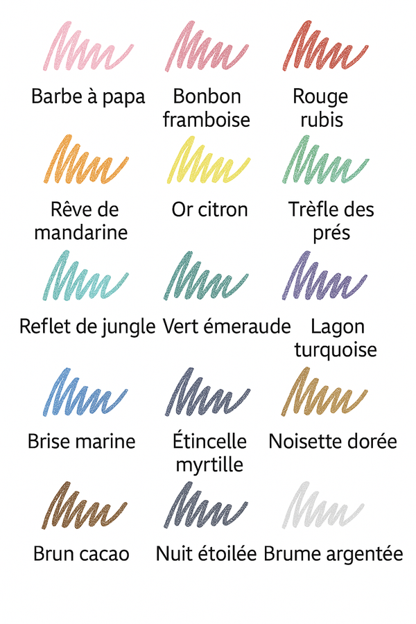Redécouvrez la joie de créer avec des lignes colorées et scintillantes qui transforment vos idées en magie. 18 couleurs étincelantes pour adultes et enfants.
